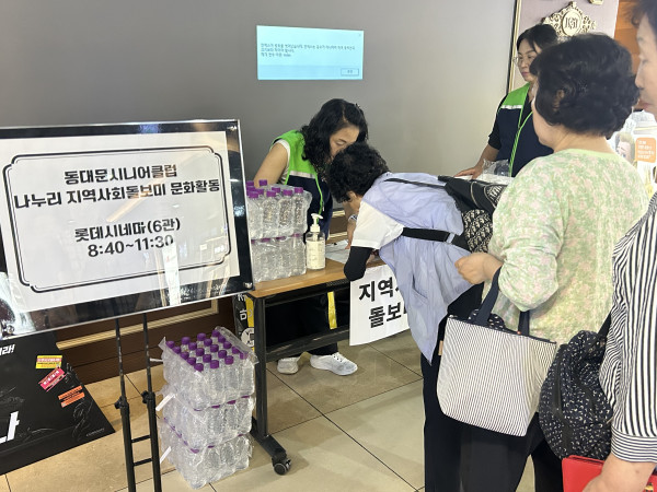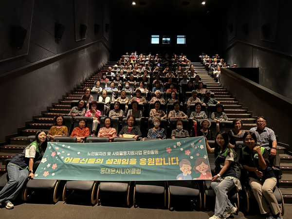 2025년 노인공익활동사업 문화활동(나누리 지역사회돌보미) 페이지 정보 작성자동대문관리자 조회 31회 작성일 2025.10.01 10:25 목록 본문 ■노인공익활동사업 문화활동(나누리 지역사회돌보미)1. 일시 : 2025. 08. 22.(금) 08:40~12:002. 장소 : 청량리역 롯데 시네마 7층3. 대상 : 나누리 지역사회돌보미 참여자 총 100명4. 내용 : 영화관람(대가족) 이전글2025년 노인역량활동사업 문화활동(나누리 안심보안관) 25.10.01 다음글2025년 노인역량활동사업 문화활동(시니어 코디네이터) 25.10.01
